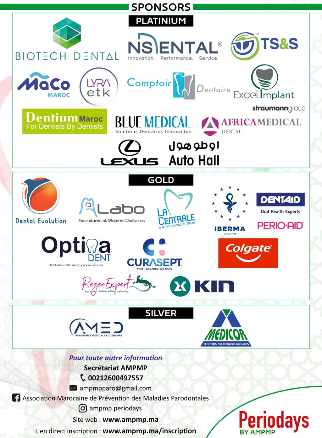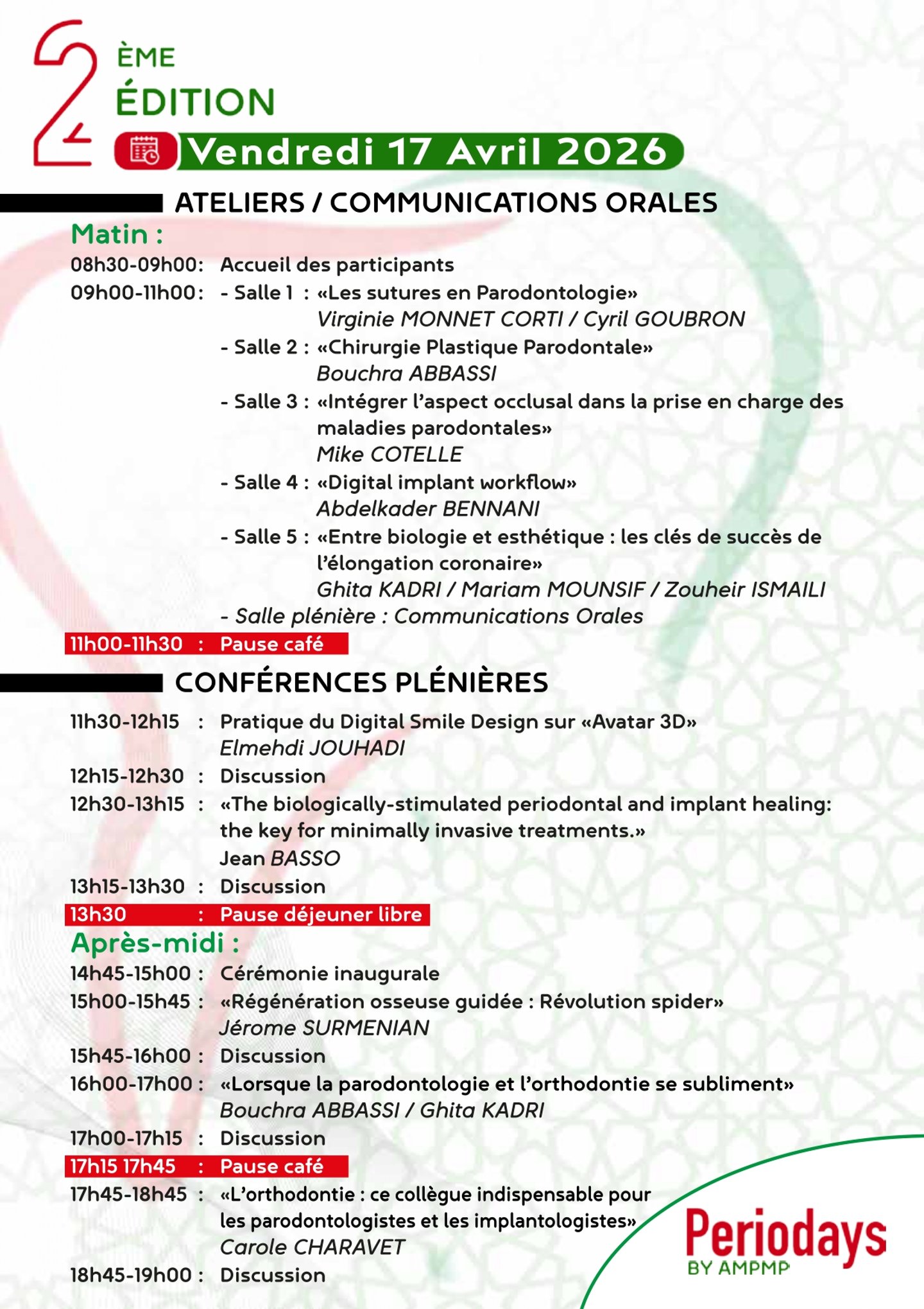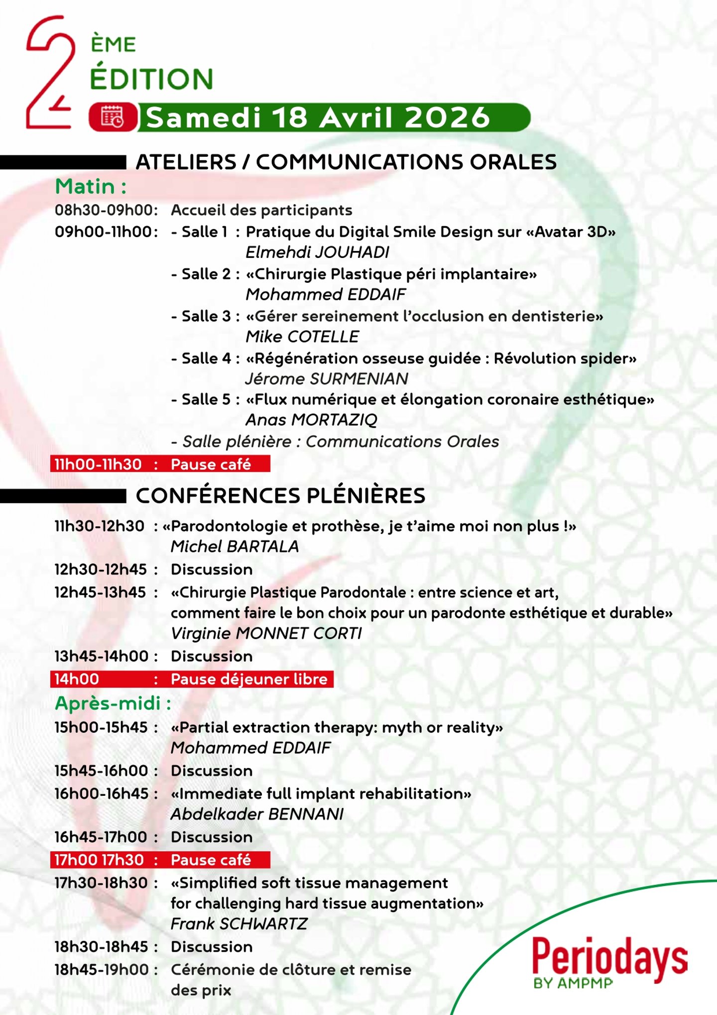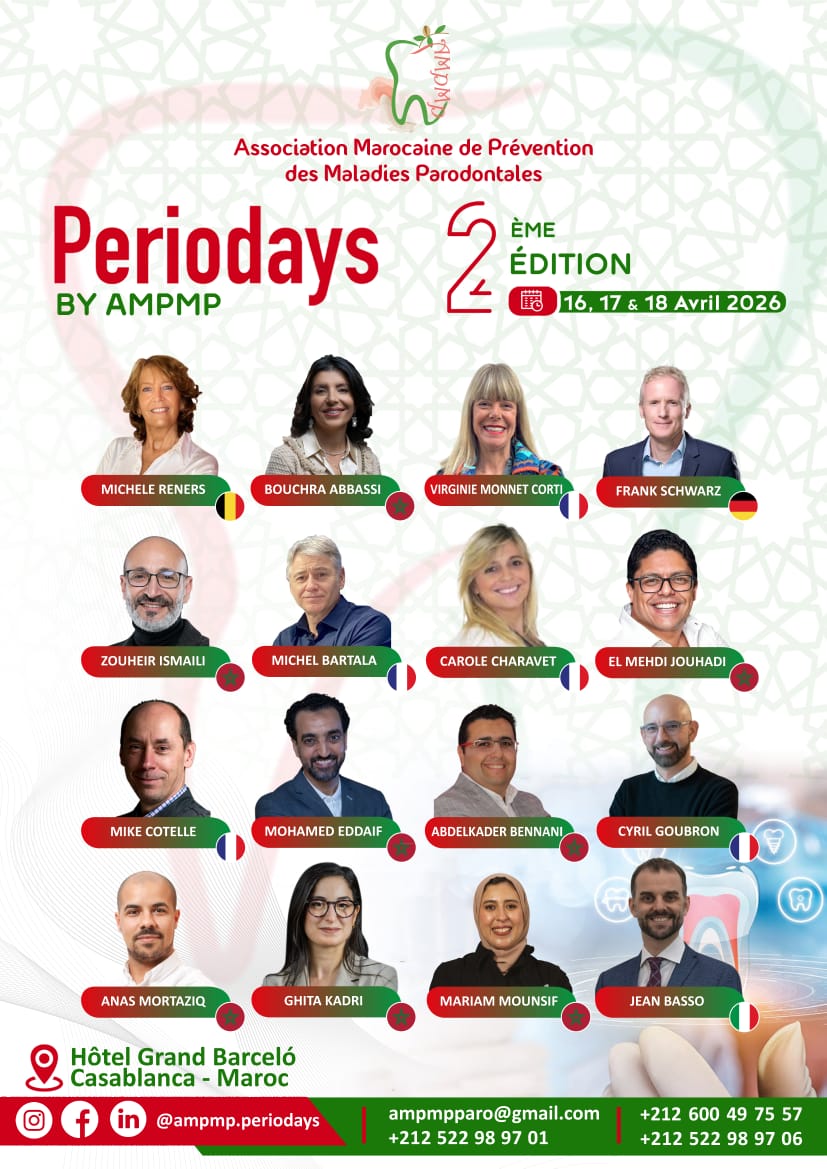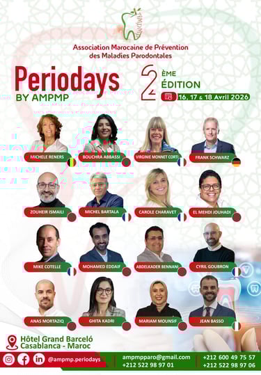 Rejoignez-nous pour les Periodays 2026 organisés par l’Association Marocaine de Prévention des Maladies Parodontales avec des conférenciers éminents dans les domaines de la parodontologie, de la chirurgie plastique parodontale occluso paro, ortho paro, de l'implantologie de la régénération osseuse guidée et de la dentisterie digitale.