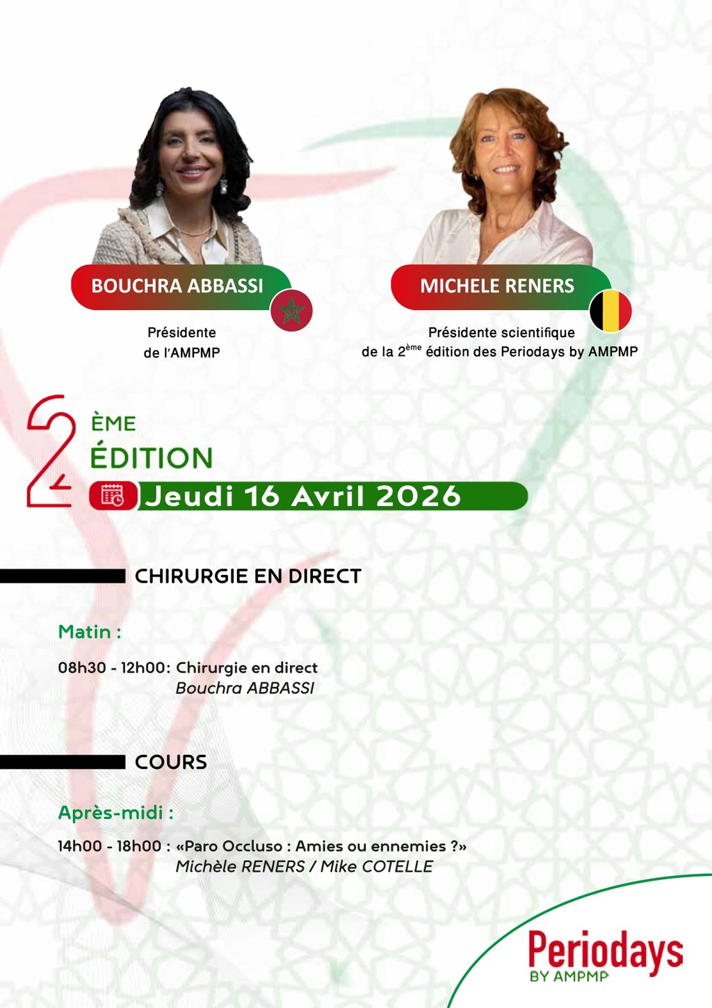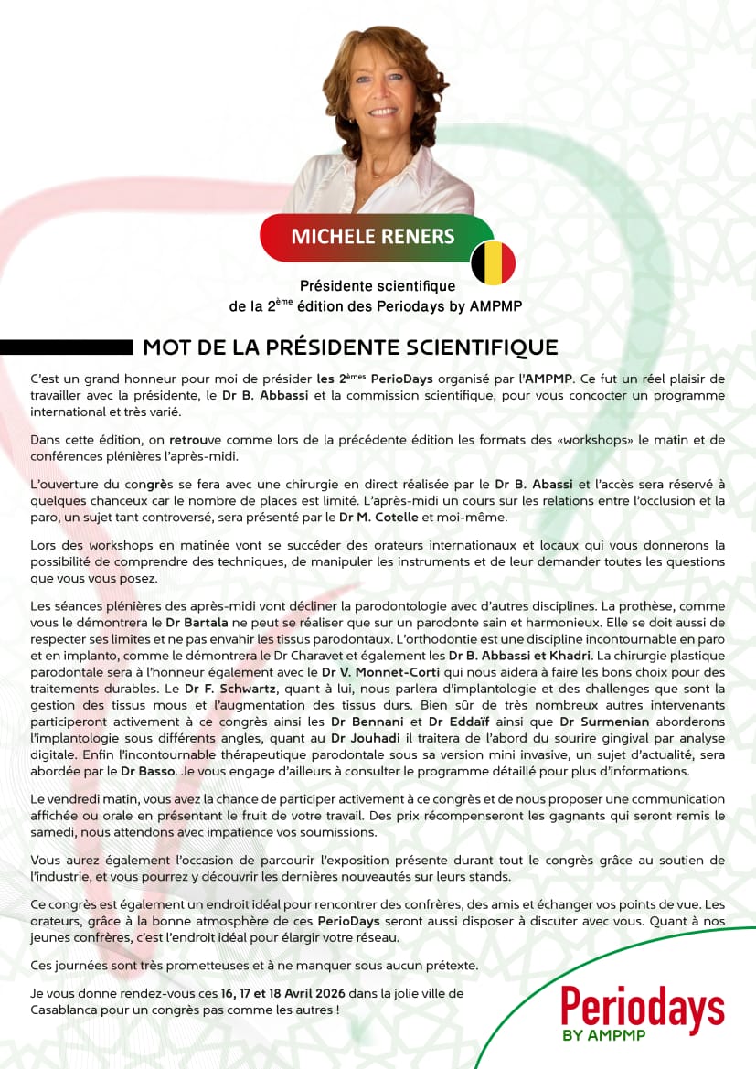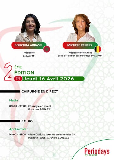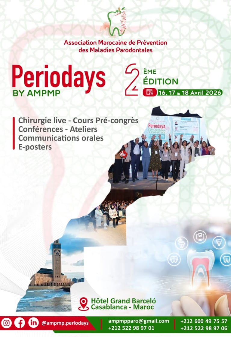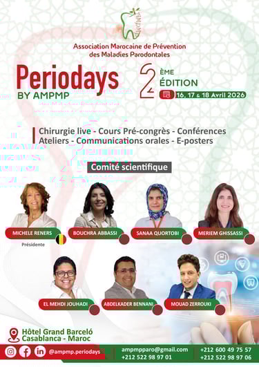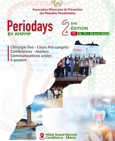 C’est avec un immense plaisir que nous vous annonçons la tenue de la 2ème édition des "Periodays" organisée par l’Association Marocaine de Prévention des Maladies Parodontales, les 16, 17 et 18 avril 2026. Cet événement incontournable mettra à l’honneur les dernières avancées en parodontologie, implantologie, régénération tissulaire relation occluso paro, relation ortho paro et l’intégration des innovations digitales dans la pratique quotidienne.